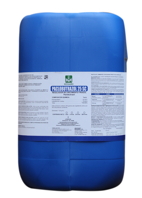 Inhibe la síntesis de giberelinas, lo que induce a una mayor producción y crecimiento de frutos. Paclobutrazol 25 SC para su formulación la aplicación se puede aplicar simple o mezclado con otro producto